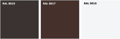 Kolory standardowe - brąz RAL8017 i RAL8019, biały RAL9010, jasne aluminium (metalic) RAL9006, antracyt RAL7016